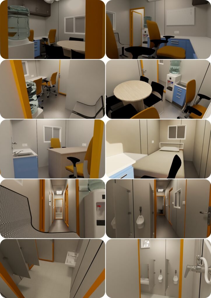 | 18 | Security Room | Size [ L x W x H]Ft. : [ 5 x 10 x 8.5 ]Ft. Bed : 6.5′ L x 3.5′ W bunk bed [Powder Coate] with mattress. Working table : 2.5′ L x 3’W x 2.5′ H Chair : 1nos LED Lights-1 nos -18 watt Cabin Fan- 2nos-450 mm Window -1nos ;[ 3.3′ L x 3.3′ W] |