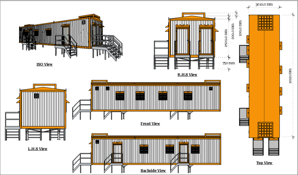 | 2 | Construction of Material | Steel : Load Bearing Member : IS 4923 or Equivalent Side End Walls : MS : IS 1079 or IS 513 or Equivalent Roof : IS 079 or IS513 or Equivalent Floor :IS 6307 or Equivalent Sanitaryware : IS 2556 or Equivalent Furniture: IS 11679 or Equivalent |