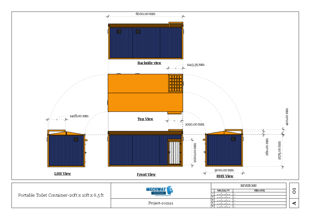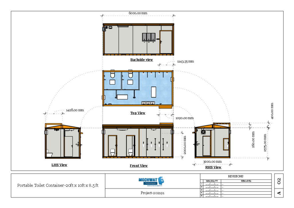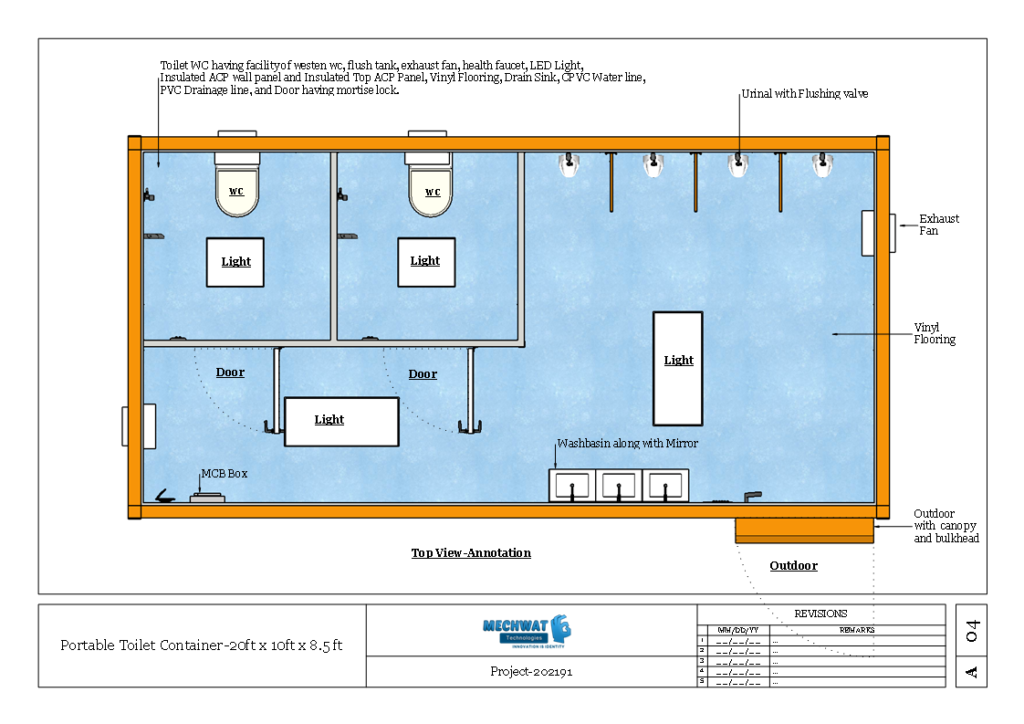 | 14 | Plumbing & Toilet Fixtures | In the washroom, the container comes complete with all internal pipelines of CPVC or UPVC Along with Toilet fixtures Such as WC, Washbasin, Faucet, wheelchair, disabled WC, bath stand, grab bar, dispenser, Urinal, etc. |