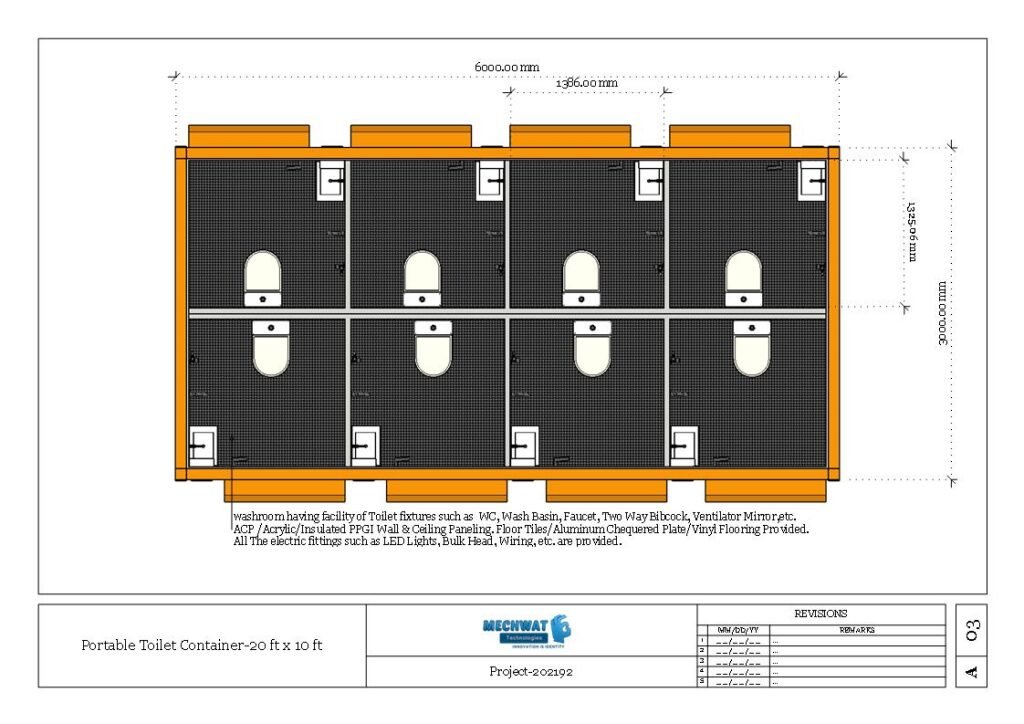 14Plumbing & Toilet FixturesIn the washroom, the container comes complete with all internal pipelines of CPVC or UPVC Along with Toilet fixtures Such as WC, Washbasin, Faucet, wheelchair, disabled WC, bath stand, grab bar, dispenser, Urinal, etc.