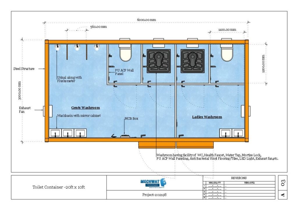 14Plumbing & Toilet FixturesIn the washroom, the container comes complete with all internal pipelines of CPVC or UPVC Along with Toilet fixtures Such as WC, Washbasin, Faucet, wheelchair, disabled WC, bath stand, grab bar, dispenser, Urinal, etc.