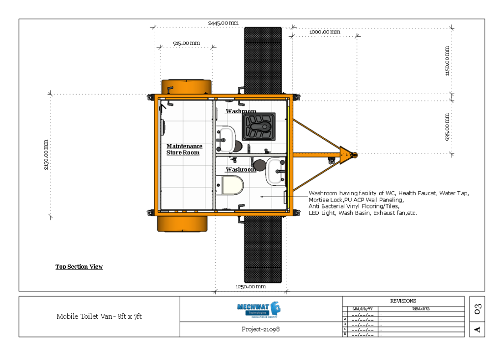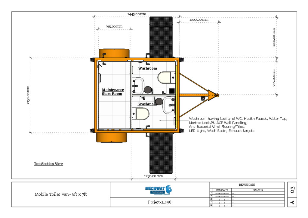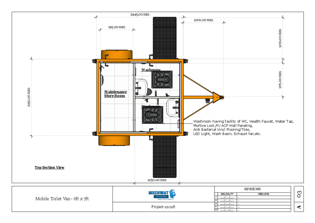 | Plumbing & Toilet Fixtures | The washroom trailer comes complete with all internal pipelines of CPVC or UPVC Along with Toilet fixtures Such as WC, Washbasin, Faucet, wheelchair, disabled WC, bath stand, grab bar, dispenser, Urinal, etc. |