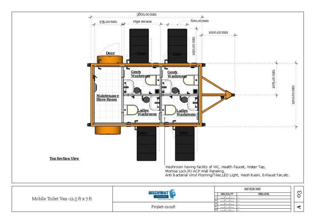 Plumbing & Toilet FixturesThe washroom trailer comes complete with all internal pipelines of CPVC or UPVC Along with Toilet fixtures Such as WC, Washbasin, Faucet, wheelchair, disabled WC, bath stand, grab bar, dispenser, Urinal, etc.