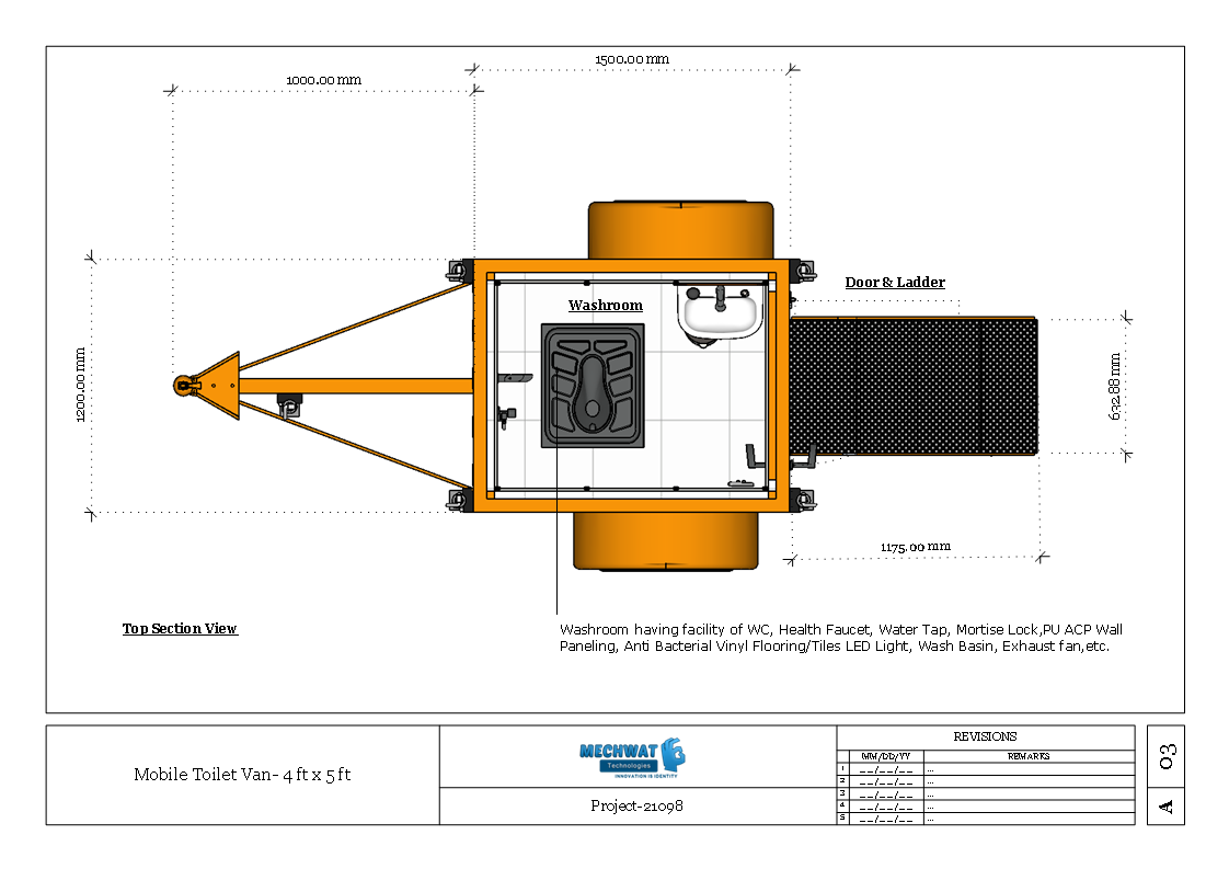 | Plumbing & Toilet Fixtures | The washroom trailer comes complete with all internal pipelines of CPVC or UPVC Along with Toilet fixtures Such as WC, Washbasin, Faucet, wheelchair, disabled WC, bath stand, grab bar, dispenser, Urinal, etc. |